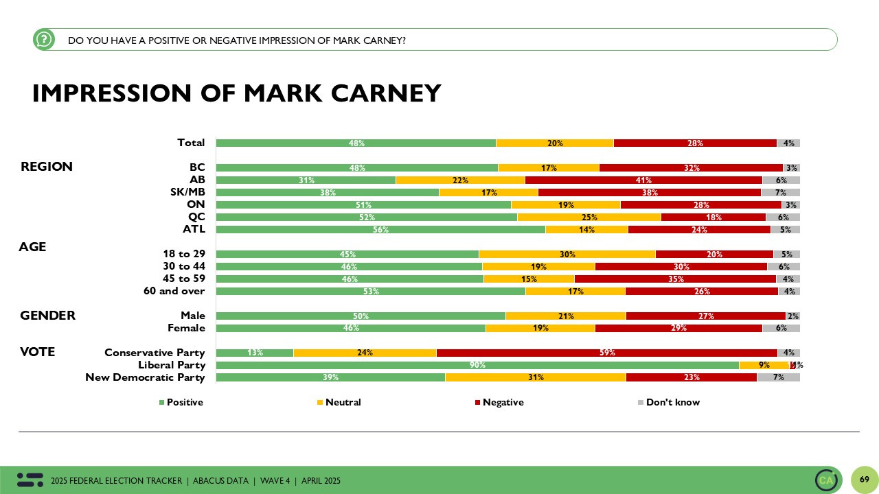 - Atlantic Canada: Carney’s net favourable rating is +32. This is a striking figure, showing that the good feelings towards him in the Atlantic provinces have grown consistently over the campaign.