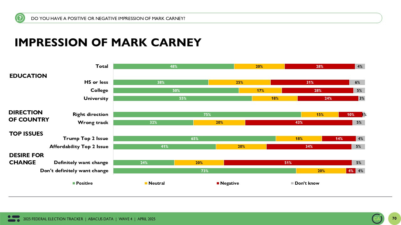 Even among those who say they “definitely want to see a change in government,” Carney still posts some surprisingly resilient numbers: 26% have a positive impression, compared to 51% who hold a negative view. While those who are itching for change are more negative than positive, that one-quarter chunk of potential swing voters indicates Carney isn’t uniformly despised by those who are seeking a new government.