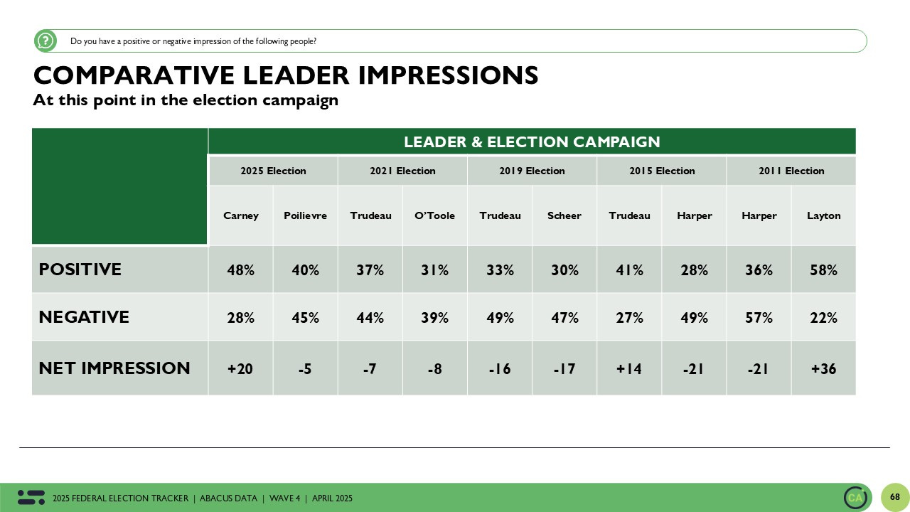To give historical context, Carney’s favourables are the highest we’ve seen from an incumbent this late in a campaign since Stephen Harper’s 2011 majority victory days, and even then, Harper was never particularly well-liked outside of his conservative base—he was more respected than he was personally liked. The only other federal leader who saw similarly widespread personal affection was Jack Layton in 2011, during the famous “Orange Wave.” While Carney may not be rewriting the political map to the same extent Layton did, he has a broad reservoir of goodwill.