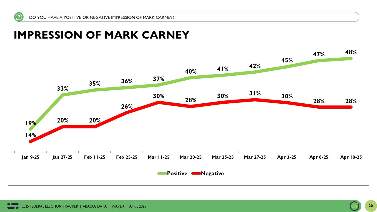 To me, the most important figure that explains this election today is Mark Carney’s net favourable rating. In an age of heightened polarization, growing regional divides, and global uncertainty—especially with U.S. President Donald Trump’s recent tariff announcements and even outlandish talk of annexing Canada as the 51st state—Carney’s ability to maintain and even grow his personal popularity may well be the central story of this campaign.