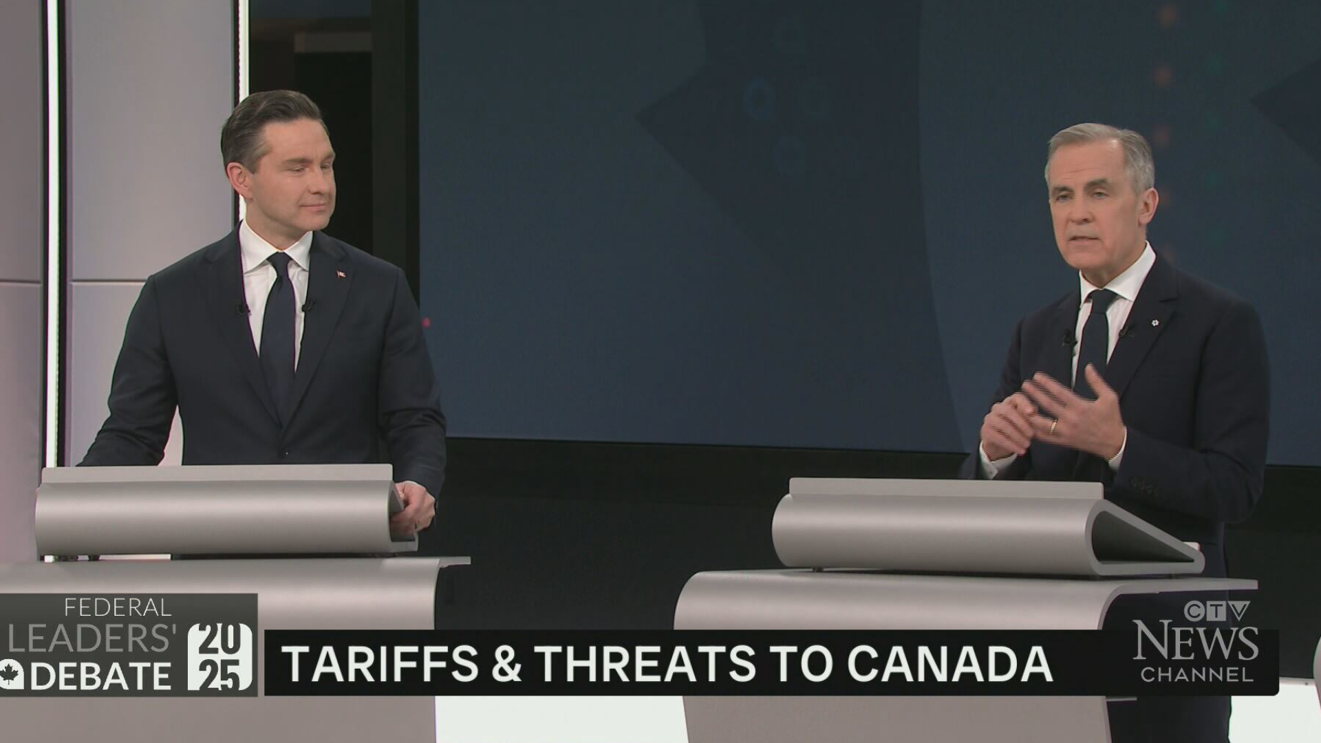 The first theme is tariffs and the threat to Canada. Moderator Steve Paikin asks what is the starting point for negotiations? Carney is up first. He says the relationship with the U.S. has fundamentally changed and the starting point has to be one of strength.“It has to show that we have control of our own economic destiny,” Carney says.He adds the Liberals would diversify Canada’s trading partners as part of their plan, while implementing counter-tariffs that have “maximum impact.”