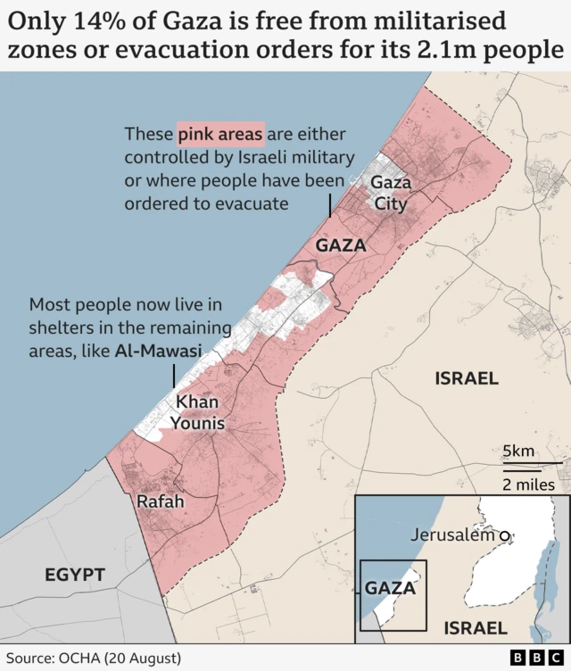 The UN says that, as of 20 August, 86% of the Gaza Strip was in either a militarised zone or under evacuation orders.