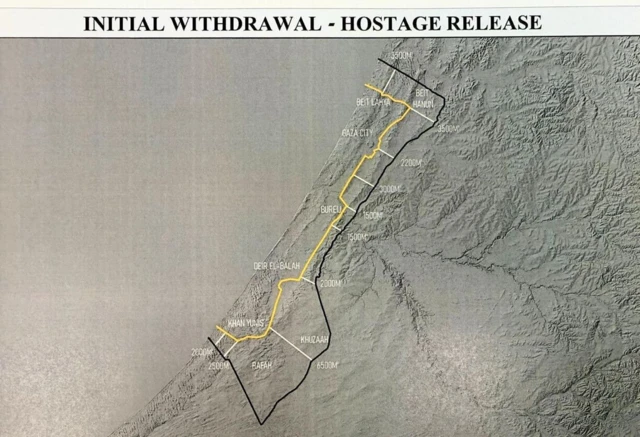Image source, White HouseAn Israeli government spokeswoman has suggested its military will withdraw to an area of the Gaza Strip shown on a "widely reported” map if the ceasefire and hostage release deal comes into effect.