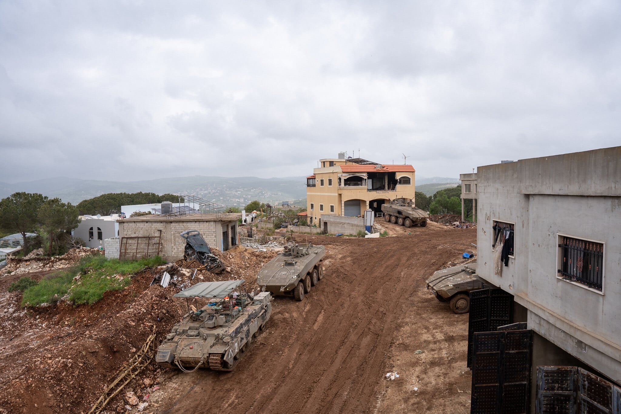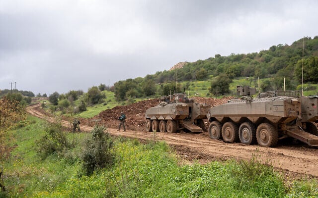 Israeli armored vehicles are seen in the southern Lebanon village of Ayta ash-Shab, April 19, 2026. (Emanuel Fabian/Times of Israel)