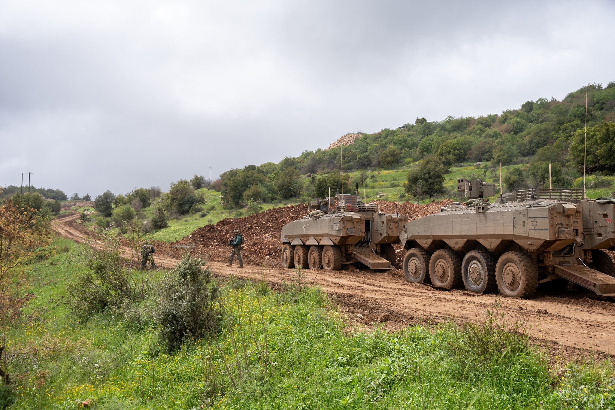 Israeli troops are seen near the southern Lebanon village of Ayta ash-Shab, April 19, 2026. (Emanuel Fabian/ Times of Israel)
