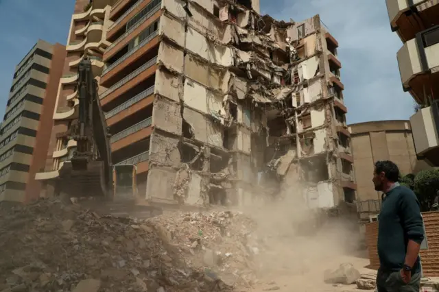 Image source, ReutersThis picture from the Reuters news agency shows Wael Sabbagh - whose mother Afaf Sidaoui and brother Hassan were killed in an Israeli strike on an apartment building on 8 April - at the site in Beirut yesterday