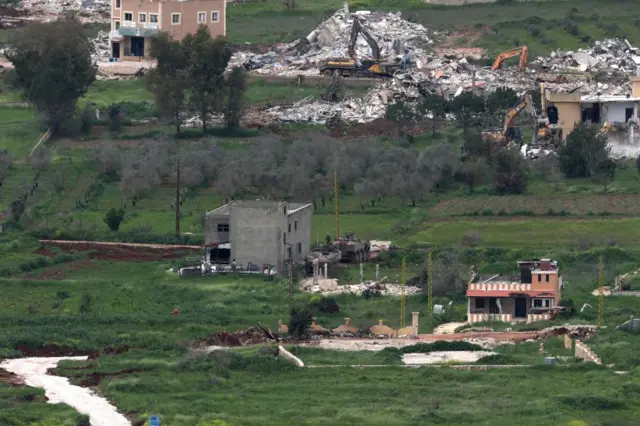 Image source,EPAImage caption, Israeli armoured personnel carriers guard excavators demolishing buildings in the southern Lebanese village of Mais al-Jabal, as seen from the Israeli side of the border yesterdayPublished at 23:21 15 April