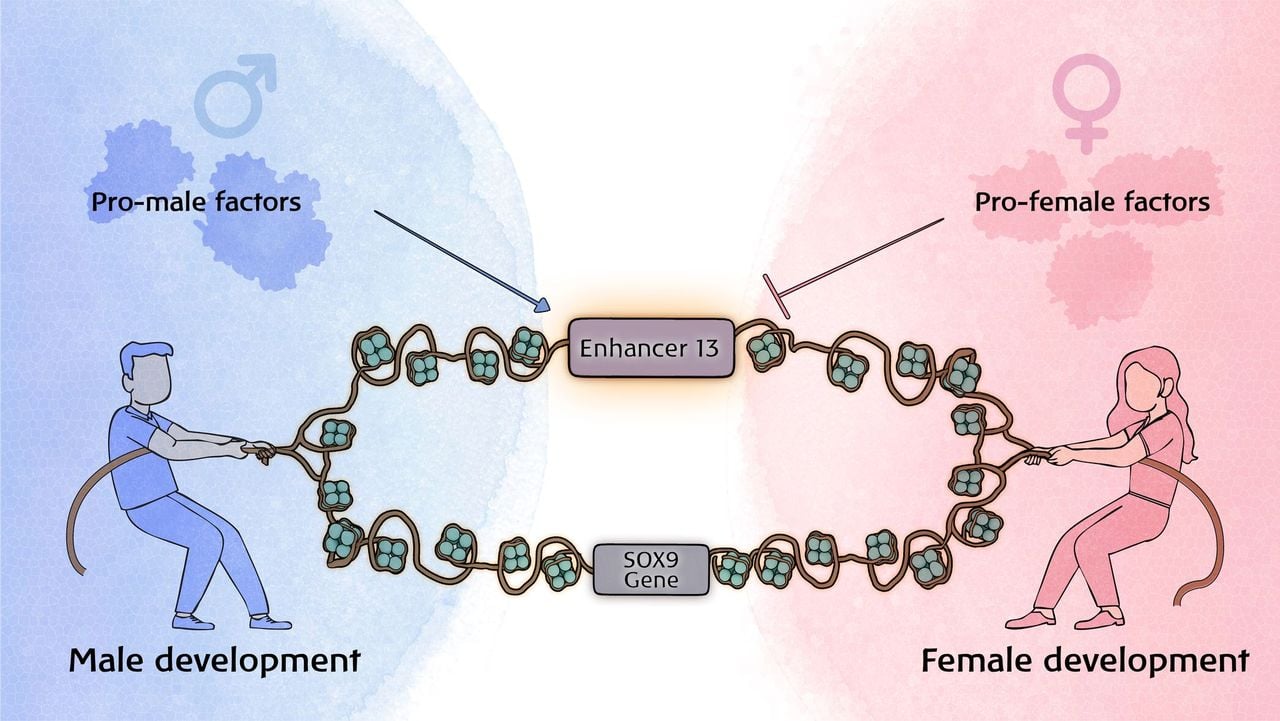 The figure depicts the Enh13 regulatory region alongside the Sox9 gene as a “battle site” between the sexes. Pro-female factors act to repress Sox9 via binding to Enh13, while pro-male factors activate it. The balance between these opposing forces ultimately determines whether male or female development occurs. (Courtesy/NetaVarsano)